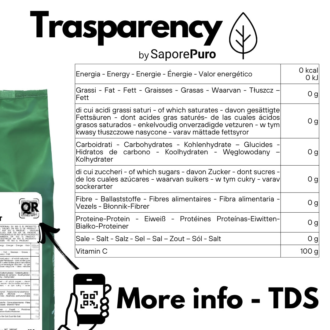 Avvertenze: Questo prodotto è un additivo alimentare (E300) e un integratore di Vitamina C. Si consiglia di consultare il proprio medico prima dell'uso come integratore, specialmente in caso di patologie preesistenti, gravidanza, allattamento o assunzione di farmaci. Non superare la dose giornaliera consigliata.