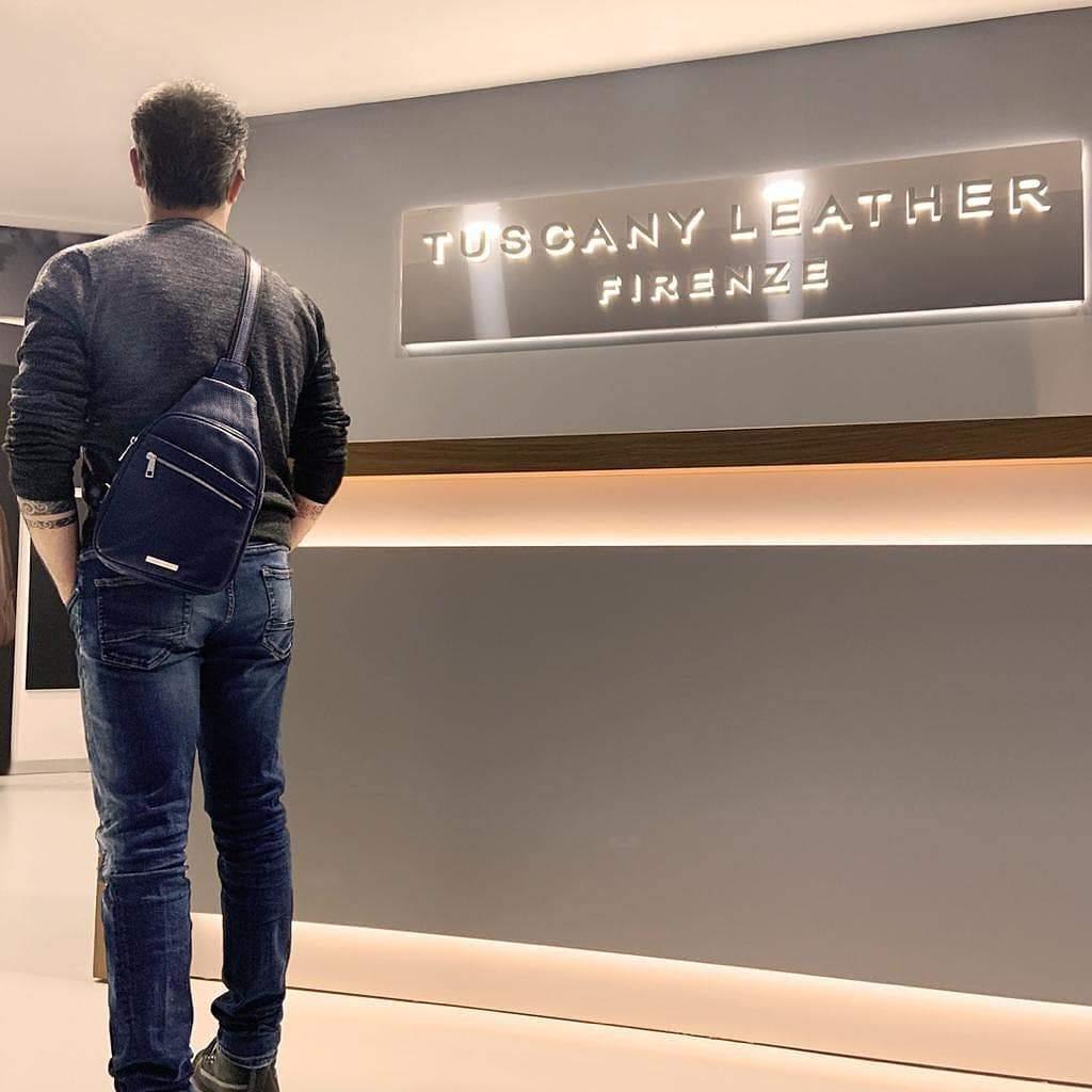 - Outside: Metal rectangle Tuscany Leather logo, 2 front pockets with zip closure