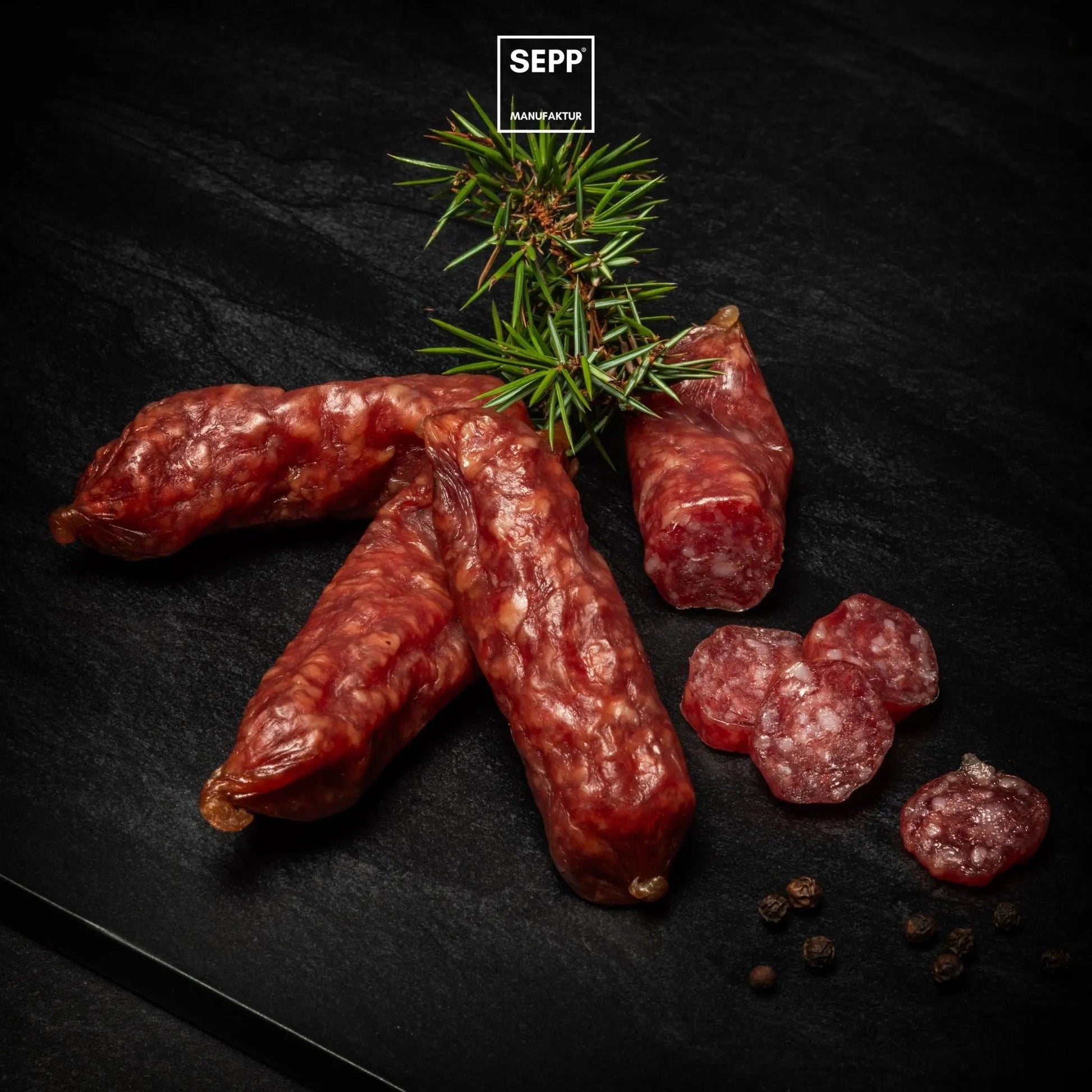 Bei den SEPP'Manufaktur SalaMINIs liegt großes Augenmerk auf der Handarbeit, dem Anteil von Fleisch/Fett und den Gewürzen. Somit ist eine einzigartig, delikate Mischung entstanden, von der wir zu 100% überzeugt sind. Aromatisch, fein würzig und mild geräuchert präsentieren sich die SEPP'Manufaktur SalaMINIs. Für die Herstellung wird Schweinefleisch (Vulkanlandschwein / AMA Gütesiegel) in Naturdarm gefüllt, geräuchert und für ca. 2 Wochen luftgetrocknet.