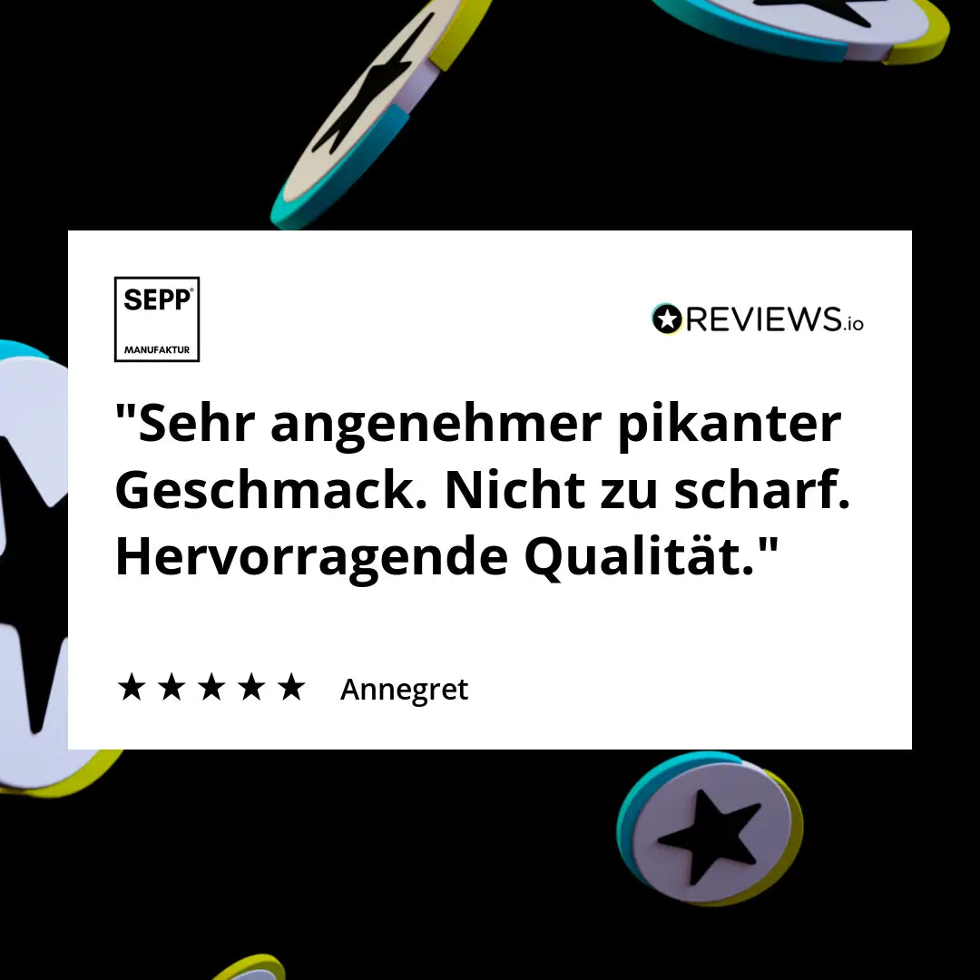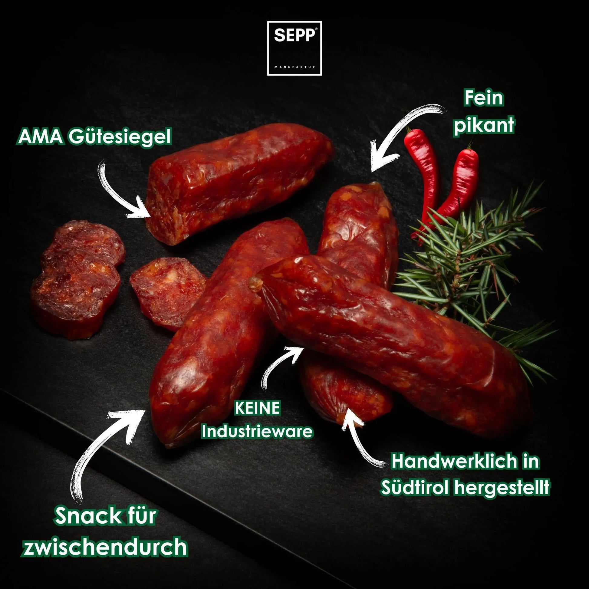 Bei den SEPP' SalaMINIs pikant liegt großes Augenmerk auf der Handarbeit, dem Anteil von Fleisch/Fett und den Gewürzen. Somit ist eine einzigartig, delikate Mischung entstanden, von der wir zu 100% überzeugt sind. Aromatisch, fein würzig, leicht pikant und mild geräuchert präsentieren sich die SEPP'Manufaktur SalaMINIs pikant. Für die Herstellung wird Schweinefleisch (Vulkanlandschwein / AMA Gütesiegel) in Naturdarm gefüllt, geräuchert und für ca. 2 Wochen luftgetrocknet.