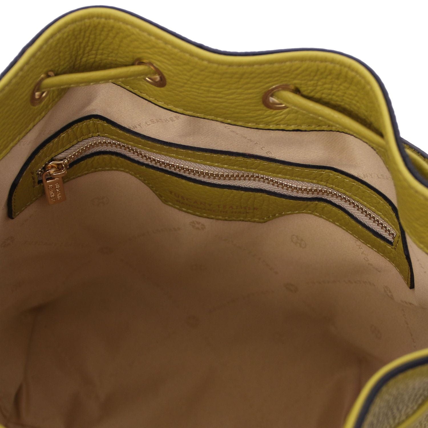 Inside, the bag boasts two slip pockets and one zip pocket to keep you organized. Designed with both elegance and practicality, this hammered leather bucket bag is an essential addition to your collection.