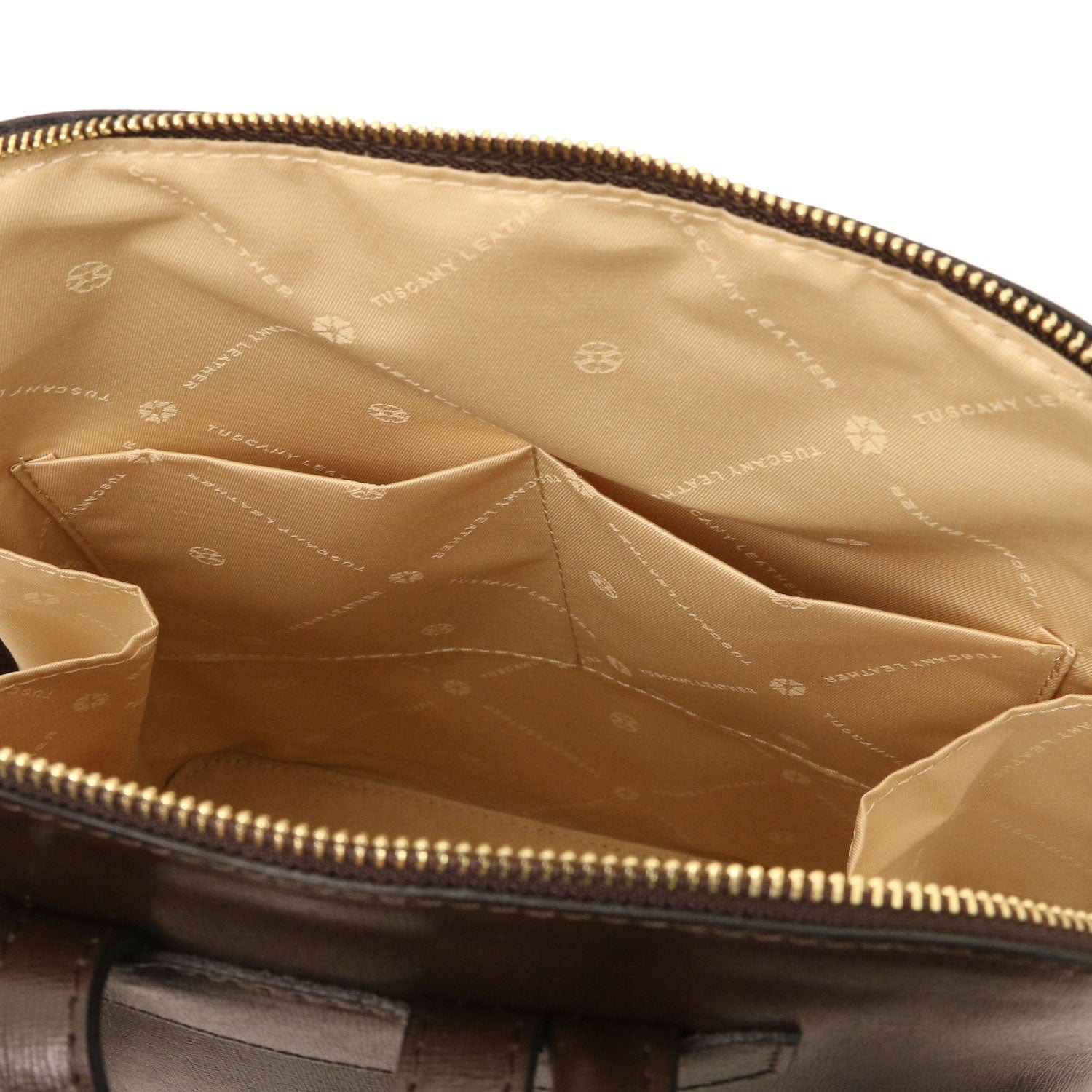 - Outside part: Metal rectangle Tuscany Leather logo, front pocket with closure, metal rectangle Tuscany Leather logo