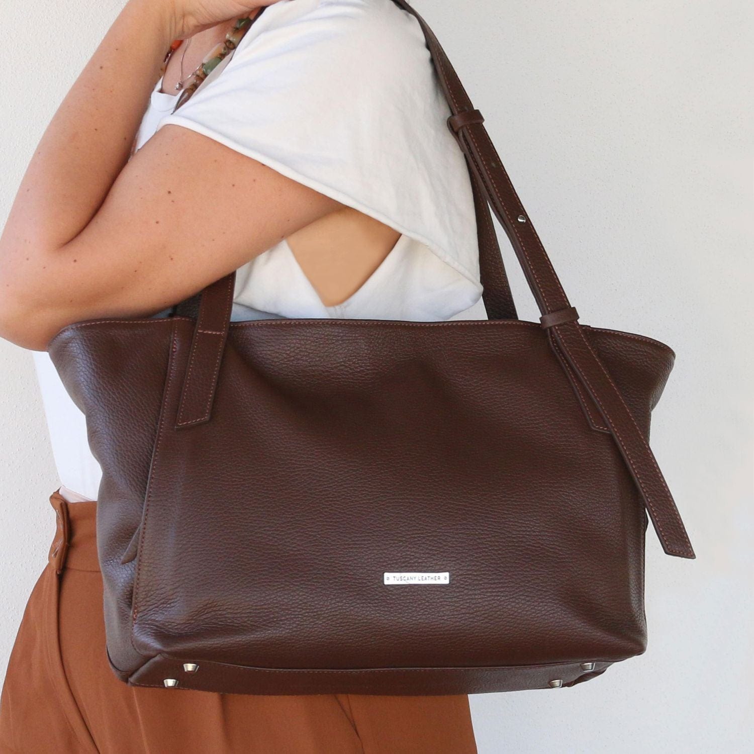 Experience the seamless blend of style and functionality with our luxurious leather tote. This exquisite piece, meticulously hand-crafted in Italy, embodies timeless elegance and practical design. The buttery soft pebbled leather offers a simple yet sophisticated appeal. Crafted from top-quality, vegetable-tanned Italian leather, this handbag boasts a spacious interior with two compartments divided by a zipped pocket, along with additional interior and exterior pockets for effortless organization.